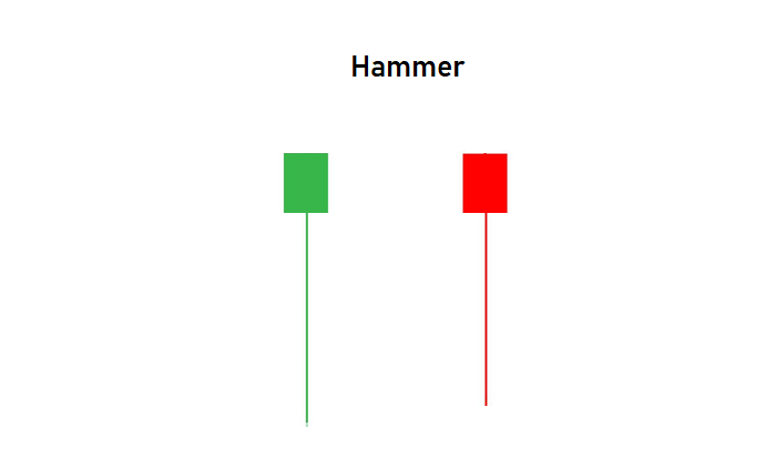 The shape of the candlestick can also be used to try and identify potential reversal patterns. The ‘hammer’ candlestick has a short body positioned at the upper end of the trading range with either little or no upper wick at the top. They can be coloured green or red:-